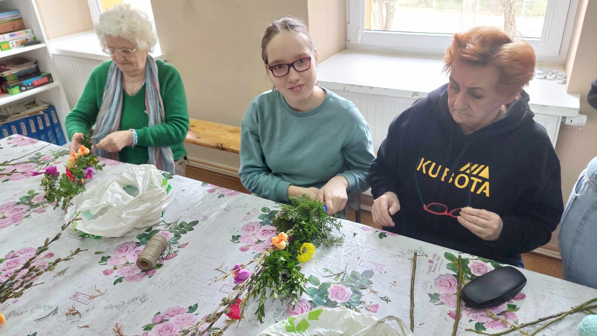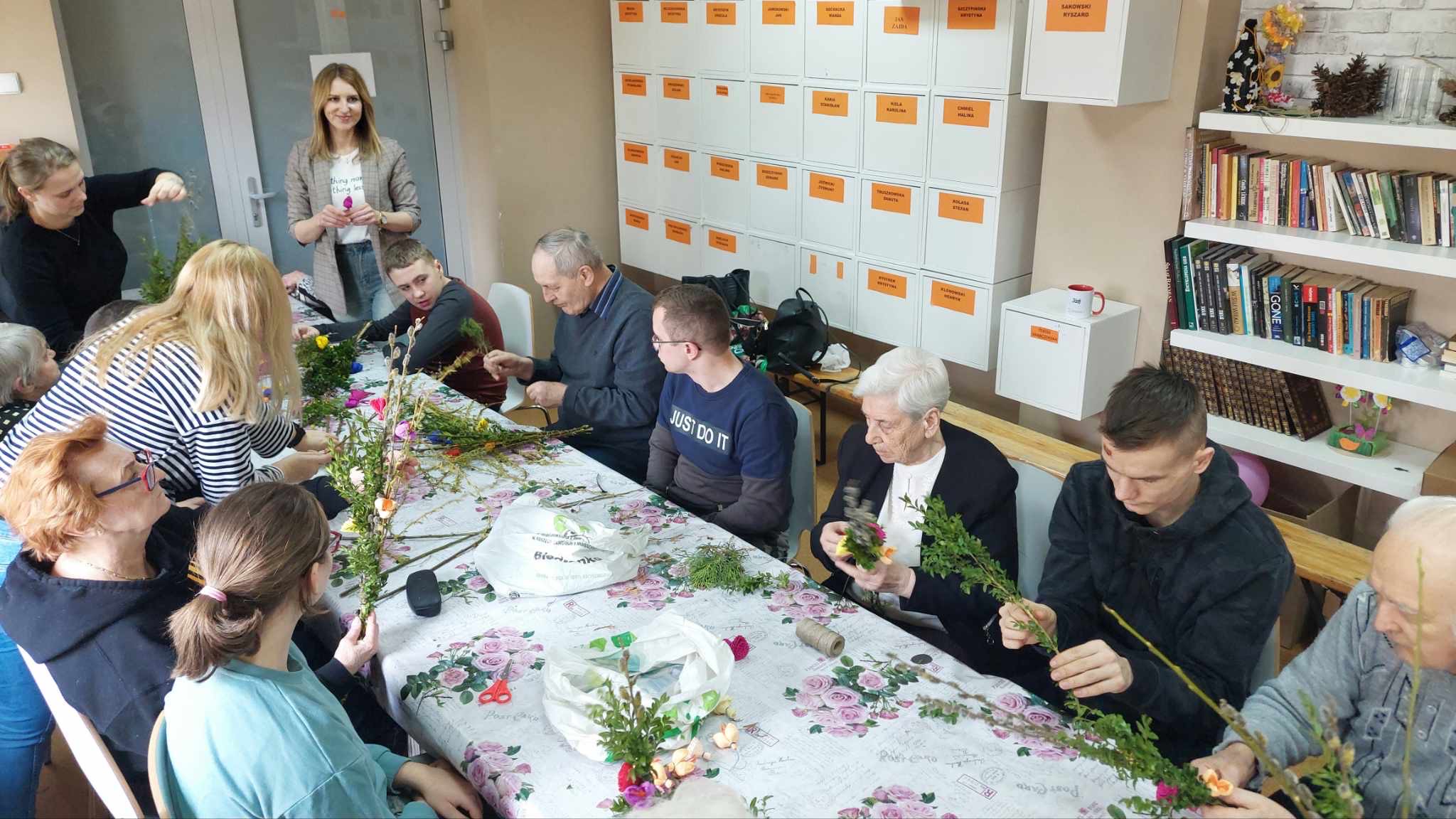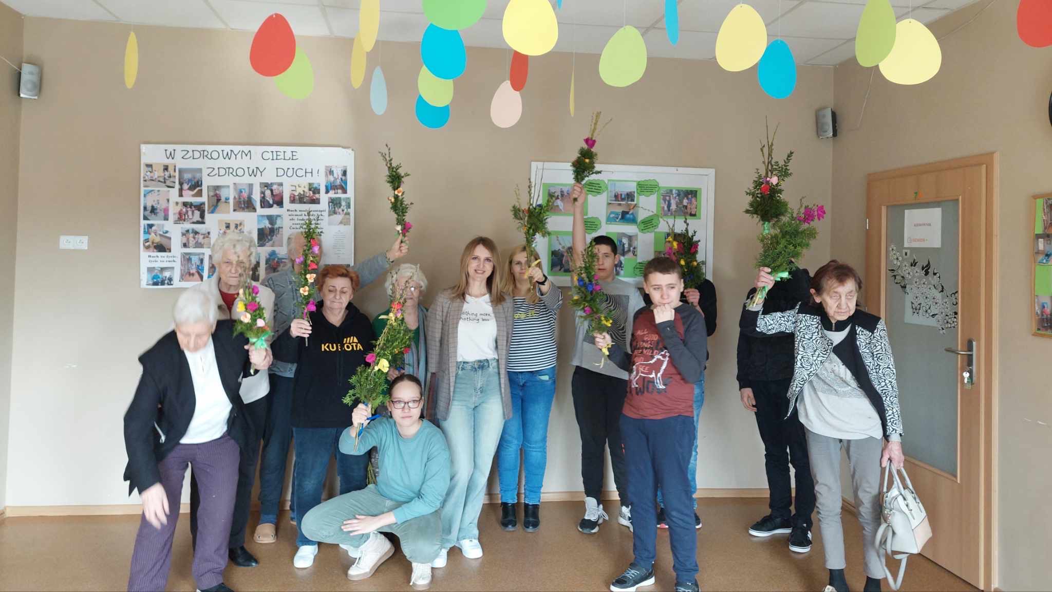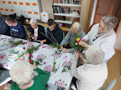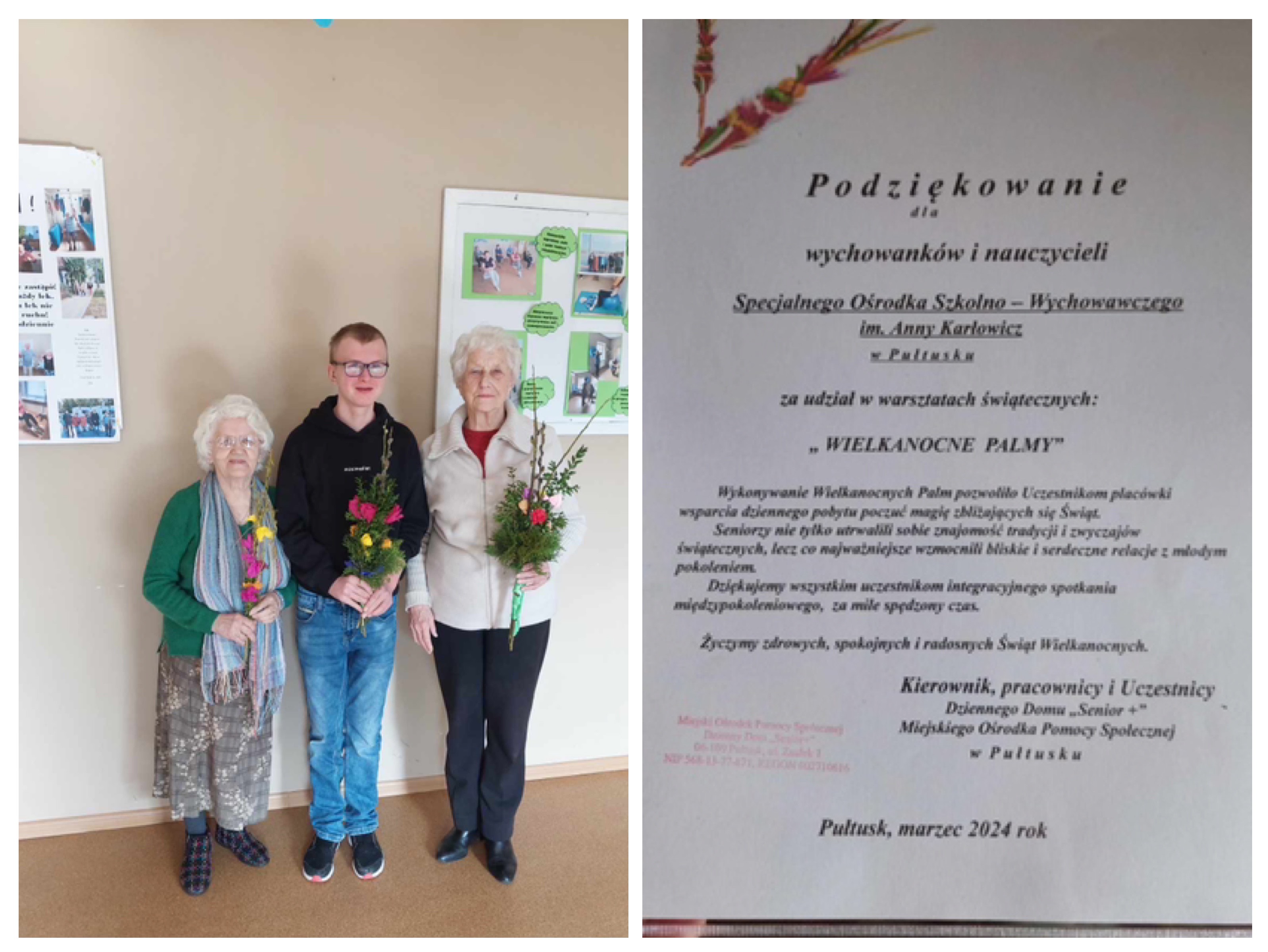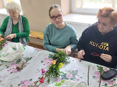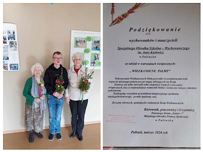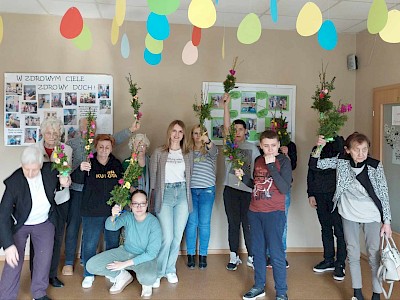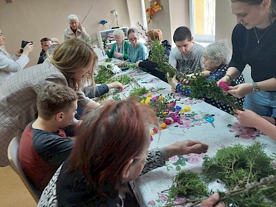Grupa uczniów SOSW im. A. Karłowicz w Pułtusku wzięła udział w warsztatach wykonywania palm wielkanocnych, zorganizowanych w Dziennym Domu " Senior +" Miejskiego Ośrodka Pomocy Społecznej w Pułtusku. Uczestnicy warsztatów otrzymali przygotowane wcześniej materiały- gałązki wierzby, bukszpanu, tui, bazi, wstążki, a także własnoręcznie wykonane kwiaty z bibuły. Uczniowie nie tylko utrwalili sobie znajomość tradycji i zwyczajów świątecznych , lecz co najważniejsze wzmocnili bliskie i serdeczne relacje ze starszym pokoleniem. Wykonane na zajęciach palmy uczniowie podarowali seniorom , które będą mogli poświęcić podczas zbliżającej się Niedzieli Palmowej.