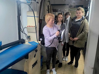 12 marca 2025 roku wychowanki IV grupy wychowawczej SOSW im. A. Karłowicz w Pułtusku w ramach realizacji doradztwa zawodowego wybrały się do pralni chemiczno ekologicznej w Pułtusku. Celem tej wizyty było zapoznanie ze sprzętem znajdującym się na miejscu, jego obsługą oraz zawodem, jaki wykonują osoby zatrudnione w pralni. Dziewczęta z zainteresowaniem oglądały obsługę pralek przemysłowych, magla oraz profesjonalnego sprzętu do prasowania. Pracownica pralni zademonstrowała wszystkie etapy pracy począwszy od segregacji prania, a skończywszy na składaniu uprasowanych rzeczy. Była to wspaniała okazja do zobaczenia prawdziwego magla oraz poznania wiele metod prasowania oraz doboru metody w zależności od rodzaju ubrań. Dziękujemy za życzliwe przyjęcie oraz interesujące przeprowadzenie zajęć.